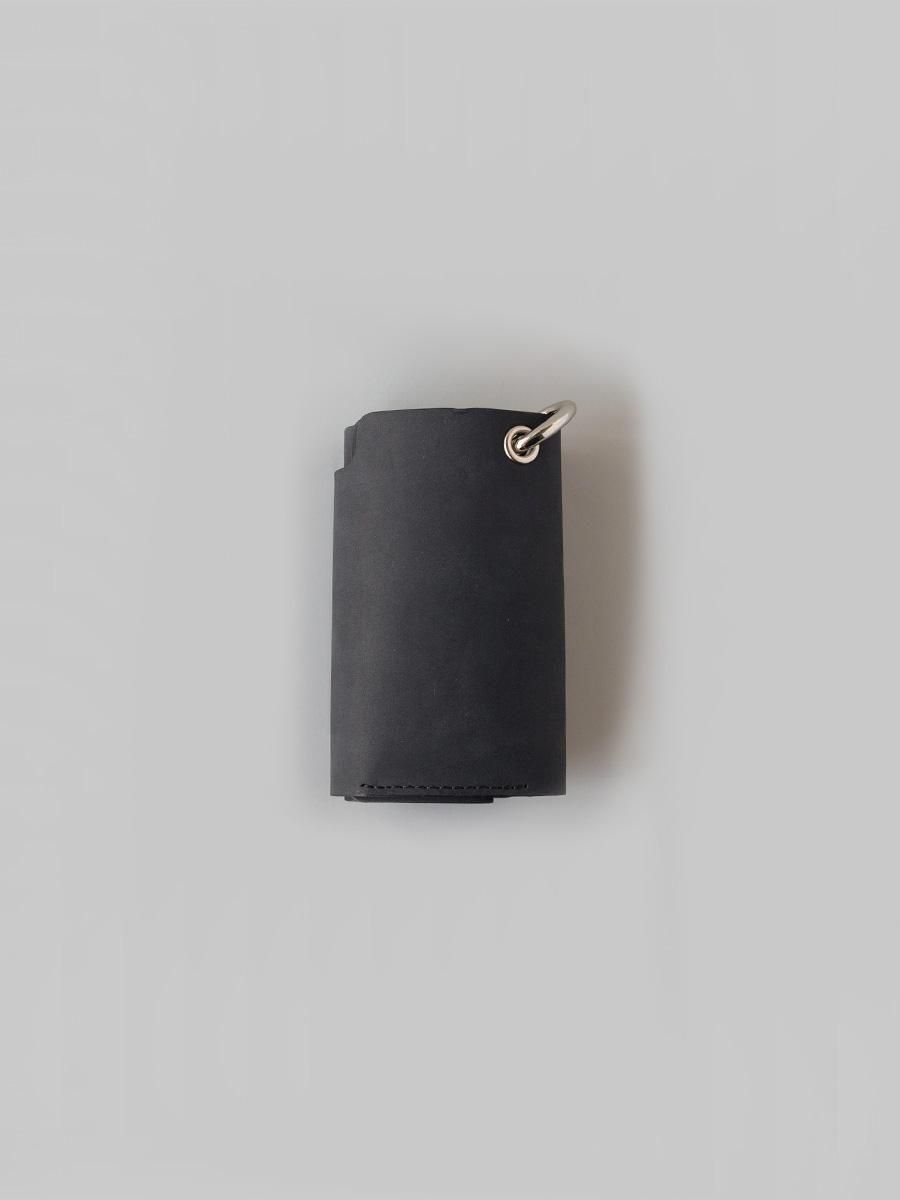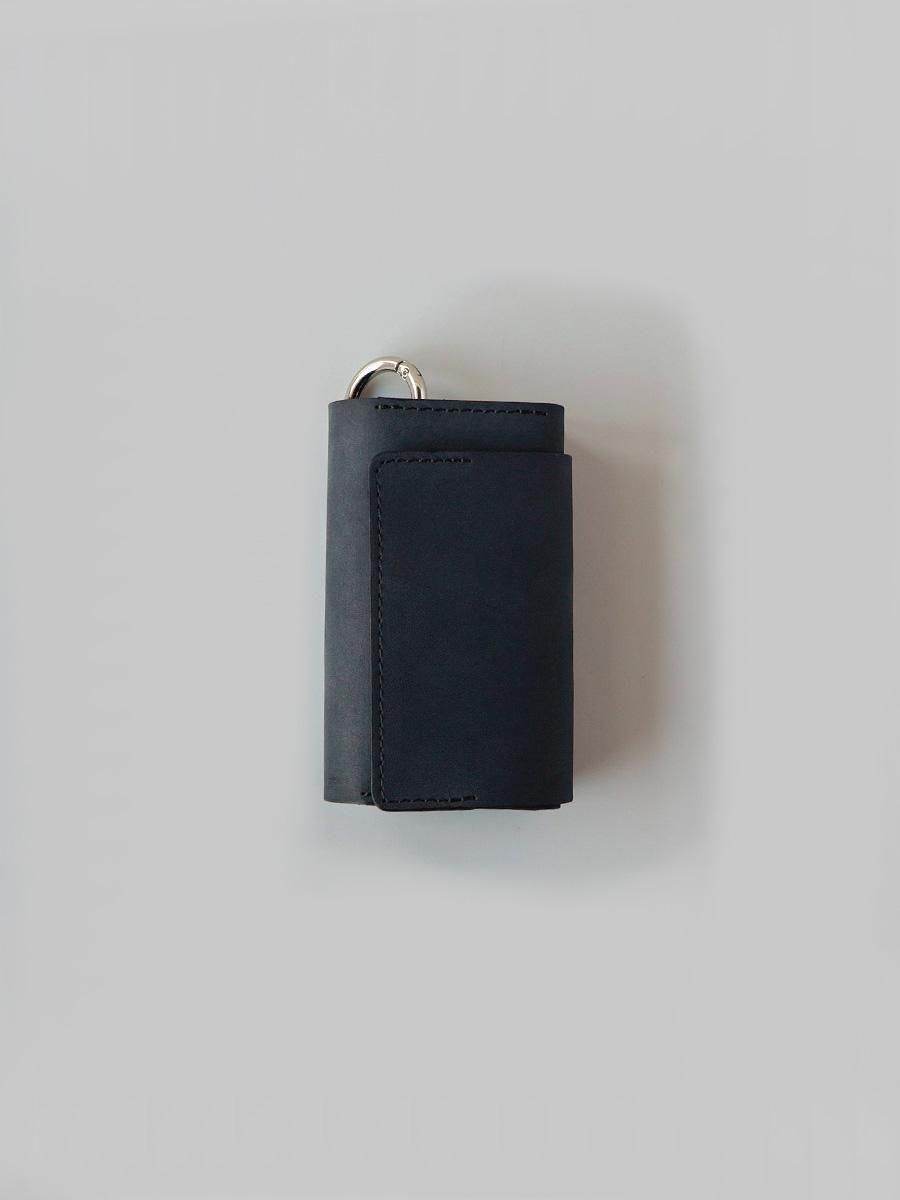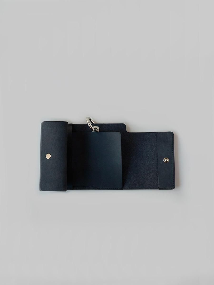 硬貨とカード、紙幣がコンパクトに収まる構造の三つ折り財布です。パズルのように組み合う型紙からできた設計は素材を無駄にしません。背面のカラビナは脱着可能です。